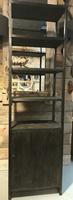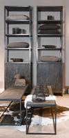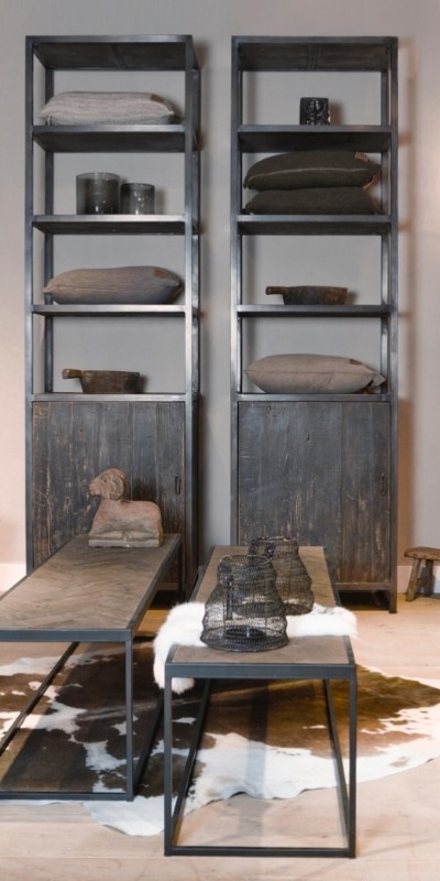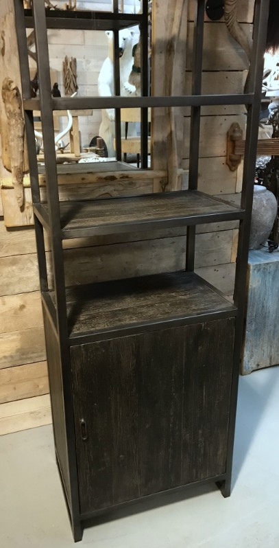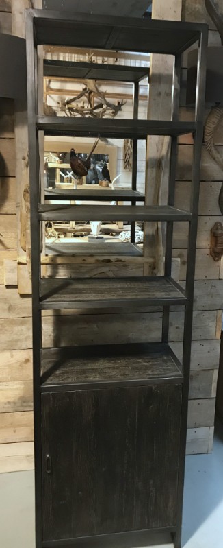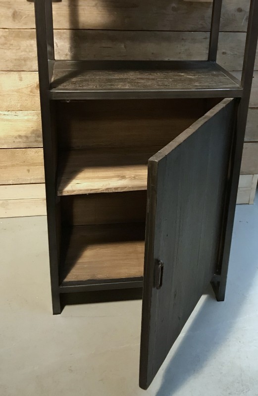 Industriele boekenkast met 1 deur en 4 open vakken.