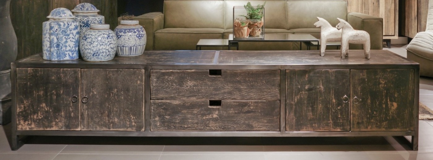 TV dressoir gemaakt van staal en hout.